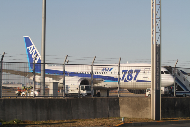 ところでそうなると、どこかでお昼寝をすることになるJA805A。普段は910番台でお休みしていることが多いようです。ここは公道からぎりぎり(二重のフェンスですが…)撮れるところなので、今日はぶらぶらと国際線ターミナルから歩いて行ってきました。車を近くに止めて撮っている人もおられるようだけれども、二車線で比較的交通量が多いので、わたしは国際線の駐車場に止めてそこから歩き。なにやらAPUの部分をメンテナンスの方たちが見ておられたようです。二重なのはセキュリティ的にも仕方ないもかもしれませんが、せめてそのフェンスの二重具合がもう少しシンプルだったら…。最近気づいたのは、ただ単に焦点距離だけでなく、シャッタースピードを上げるとフェンスが写りこみにくいんですね。もう少し工夫してみます。